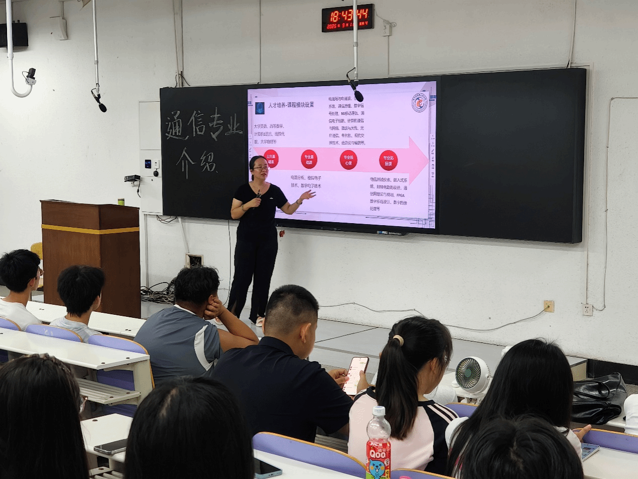 紧接着,王昕老师立足专业建设,从课程体系的结构化设计、实验室与实训基地的资源整合、先进实验条件的配置优化,以及学生就业与深造的多元路径四个维度,系统而全面地剖析了通信工程专业的广阔前景与发展方向。她通过具体实例和数据,为同学们清晰勾勒出从理论到实践、从校园到行业的完整发展图景,帮助大家进一步明确学习规划与职业目标。