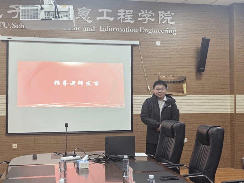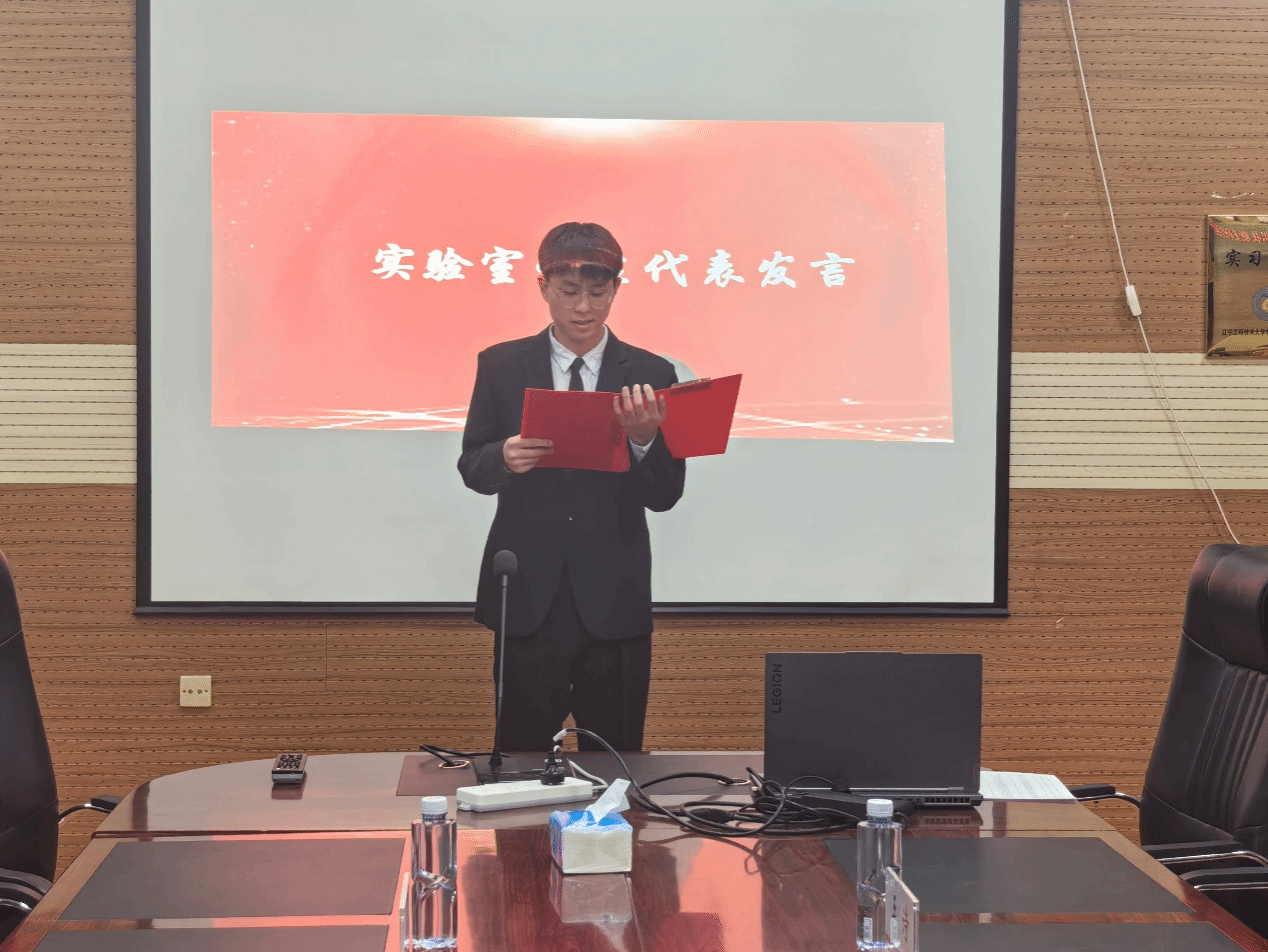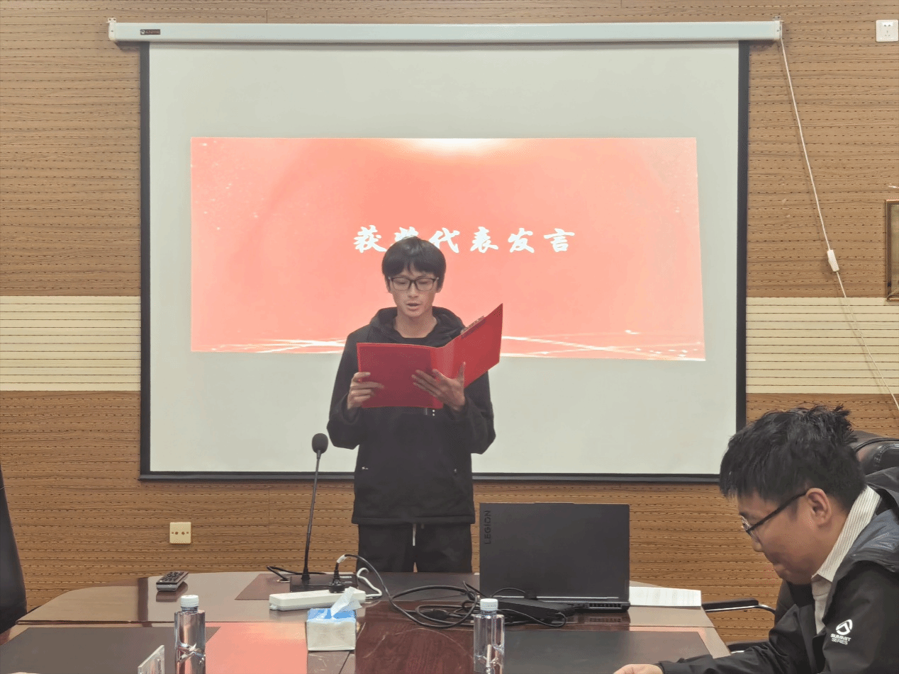 云部落实验室负责人电信23-2班朱佳鑫同学作为实验室代表发言。他表示,实验室作为学生实践创新的重要阵地,始终为同学们提供专业的设备支持与技术指导,并从个人亲身经历出发,鼓励同学们以本次竞赛为契机,设定清晰的目标,积极报名学院的各类实验室和科研项目,在实践中学习,在挑战中成长。