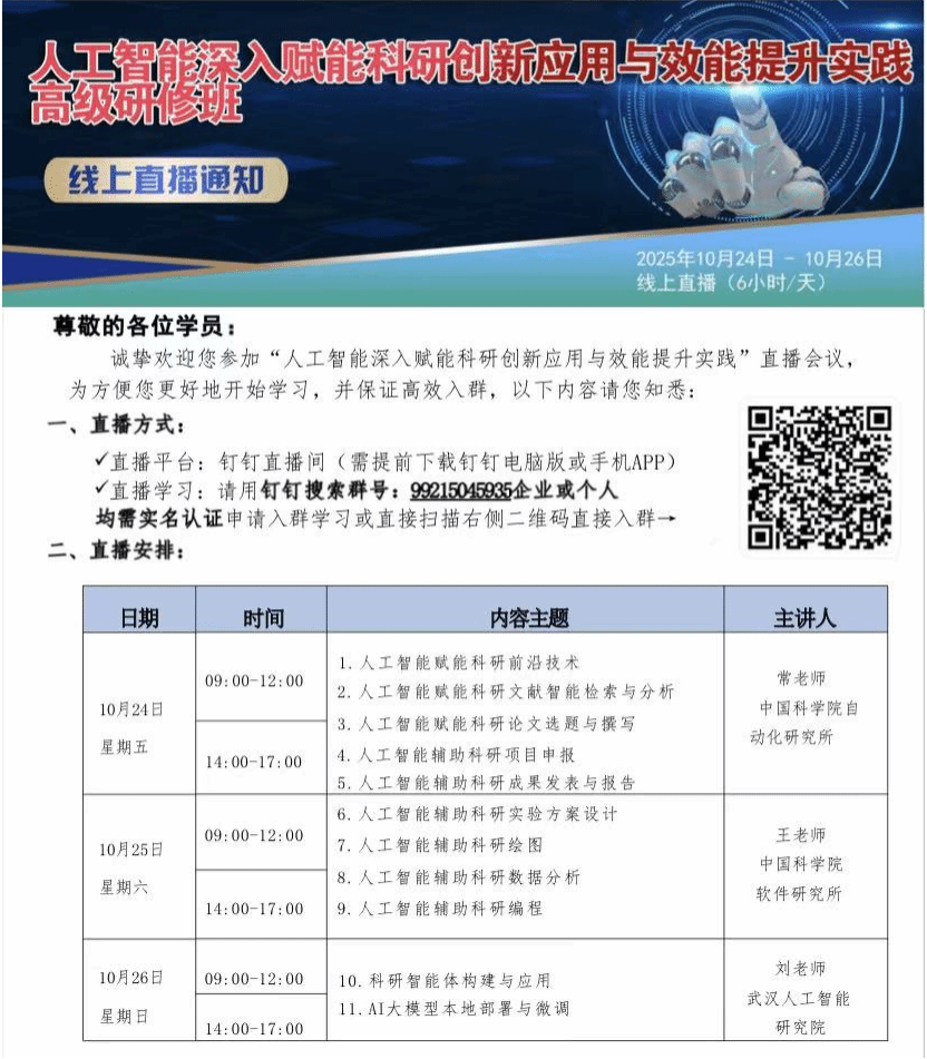 为探索人工智能技术在前沿科学研究中的深度融合路径,提升教师及科研人员的创新效率与核心竞争力,我院选派十余名教师参加由中国科学院人才交流开发中心主办的“人工智能深入赋能科研创新应用与效能提升实践”专题培训。