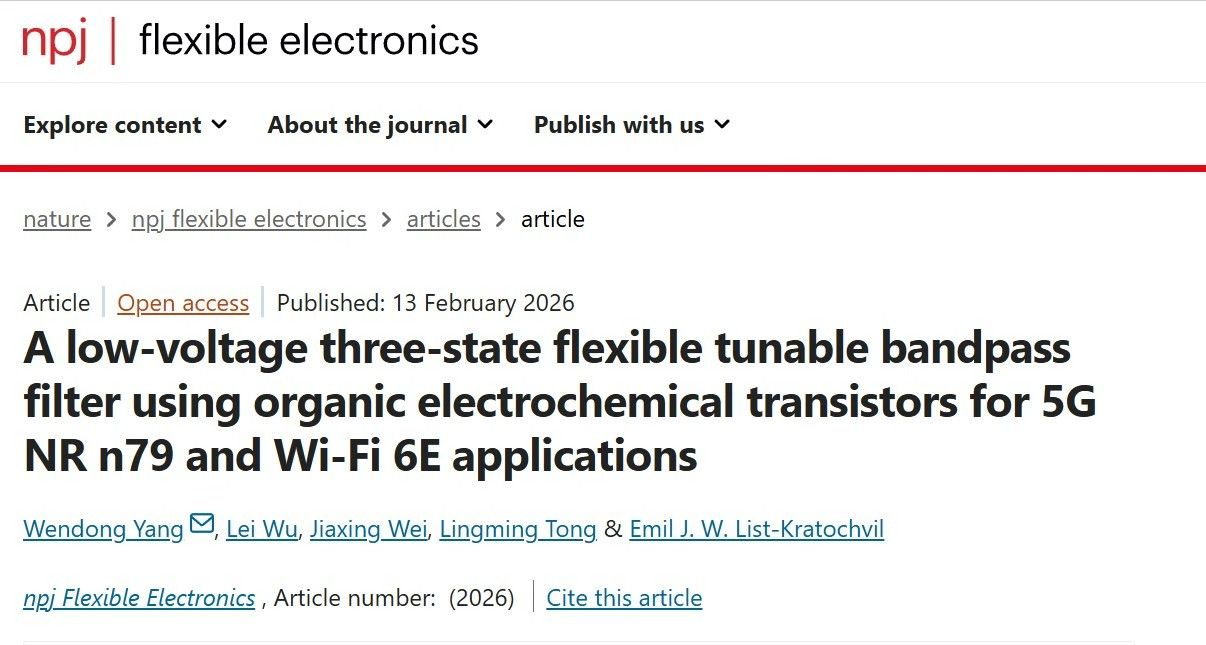 近日,我院杨文冬教授研究组在柔性电子领域国际顶级期刊、Nature子刊《npj Flexible Electronics》(影响因子15.5,中科院1区Top期刊)上,成功发表题为"A Low-Voltage Three-State Flexible Tunable Bandpass Filter Using Organic Electrochemical Transistors for 5G NR n79 and Wi-Fi 6E Applications"的研究论文。该成果第一署名单位是辽宁工程技术大学,合作单位是柏林洪堡大学。第一作者及通讯作者是杨文冬教授,我院硕士生吴磊是学生第一作者。