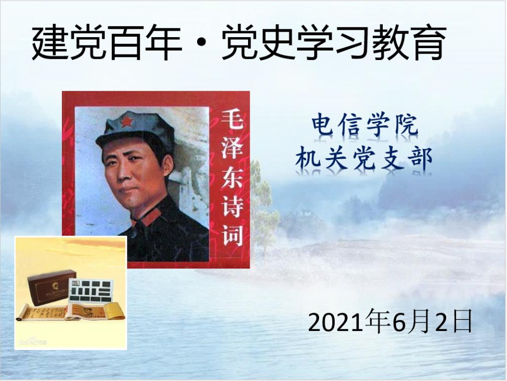 为迎接中国共产党建党一百周年,讴歌中国共产党为实现中华民族伟大复兴的百年奋斗历程,电信学院机关党支部于2021年6月2日14:00举行了由全体党员参加的“朗诵毛主席诗词,重温红色经典”主题党日活动,学院党委书记王永贵也参加了本次活动。