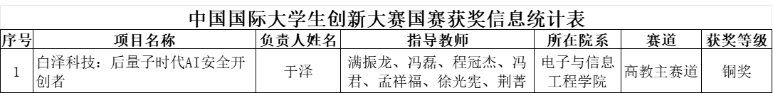 在刚刚落下帷幕的中国国际大学生创新大赛(2025)中,我院“白泽科技:后量子时代AI安全开创者”项目团队,经校赛选拔、省赛突围、国赛网评等多轮激烈角逐,最终斩获国家级铜奖。